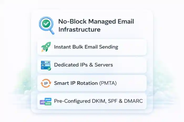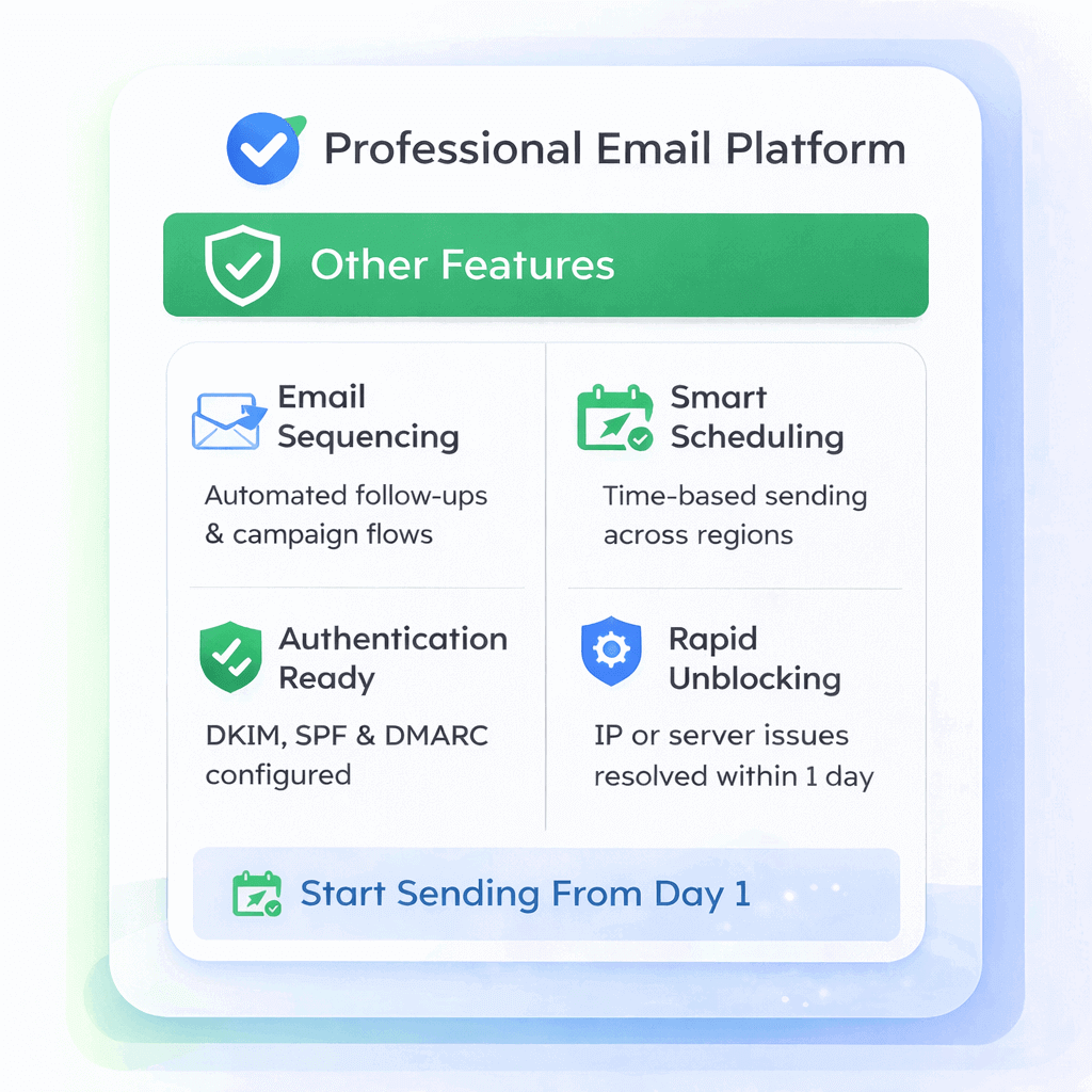 Every setup comes pre-configured with dedicated IPs, servers, SPF, DKIM, and DMARC—fully optimized for high inbox placement. No warm-up delays, no technical setup, and no trial-and-error. You’re ready to send from Day 1.